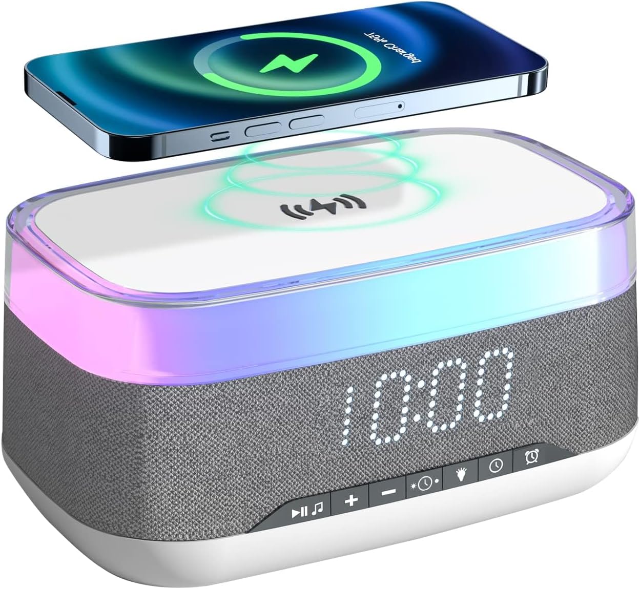 - 🌈 - 【چراغ شب ۷+ رنگ و کنترل حجم صدای بدون دردسر】از میان بیش از ۷ گزینه نور محیطی انتخاب کنید، از جمله رنگهای چرخشی، رنگهای ثابت، یا خاموش کردن نور. حجم صدای اسپیکر را مستقیماً از روی ساعت با استفاده از دکمههای «+» یا «-» تنظیم کنید و دیگر نیازی به دسترسی به دستگاه خود نداشته باشید.