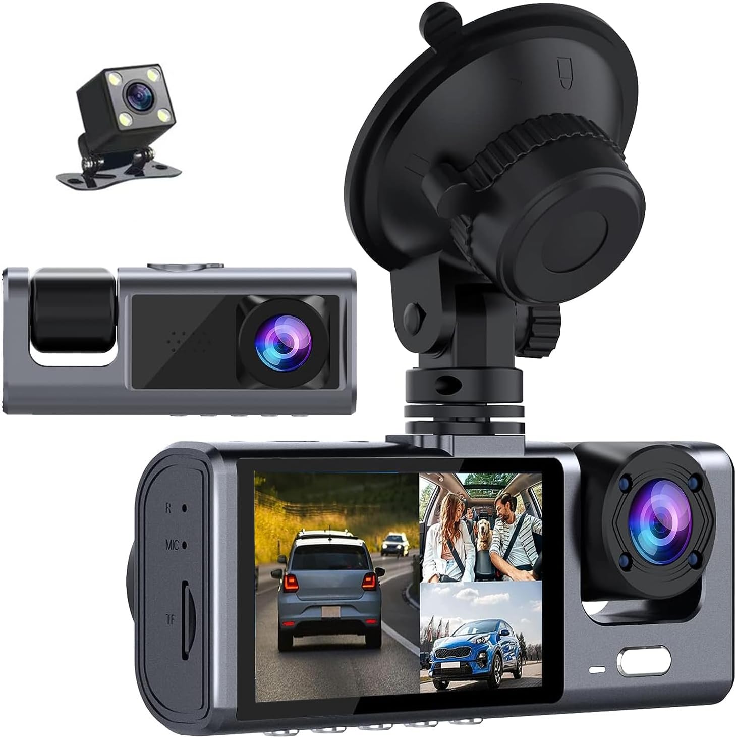 - 【دوربین خودرو 1296P جلو و عقب و داخل با نمایشگر HD】چیپست و سنسور با کارایی بالا کمک میکنند تا ویدئوی جلوی 1296P + ویدئوی داخل کابین 720P + ویدئوی عقب 720P بهصورت روان ضبط شود. ویدئوهای 3 کاناله روی صفحهنمایش IPS نمایش داده میشوند و بازخورد ویدئویی زنده از 3 سمت خودروی شما ارائه میدهند.